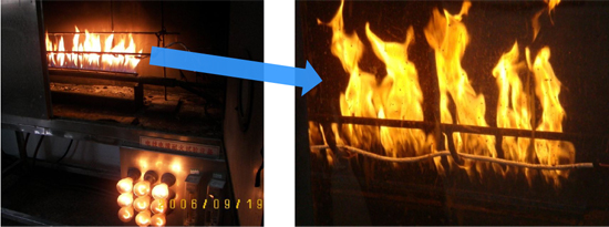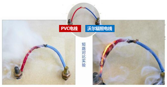 PVC电线已起火燃烧,并冒出大量浓烟;沃尔辐照交联电线(富社电线)却完好无损。