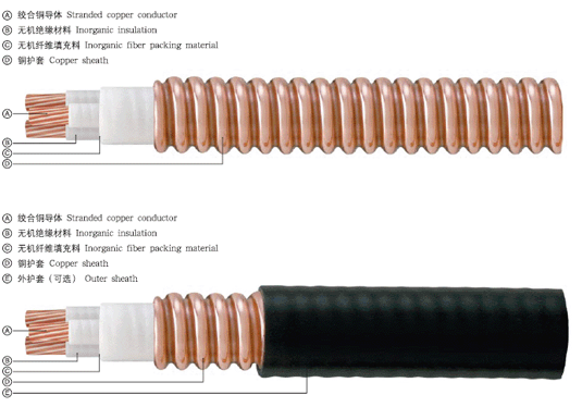 ①铜导体②耐高温(1375℃)不会燃烧的无机(矿物)绝缘带绝缘③外铜套