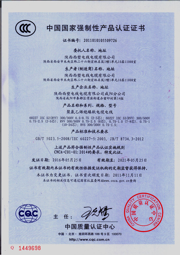 陕缆电缆 RVV软电线电缆 3C强制性产品认证证书
